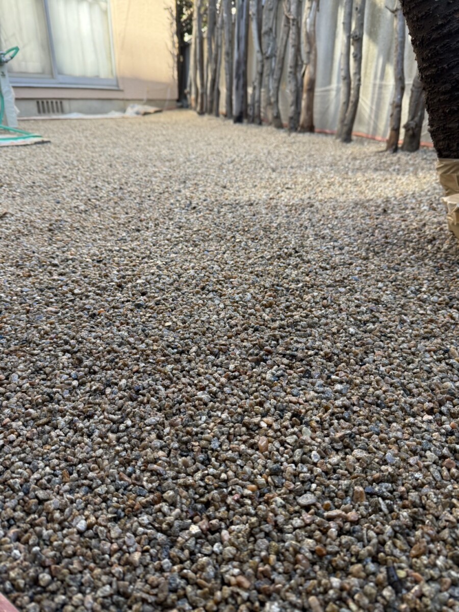 砂利を敷き均し、特別なスプレーを散布して【固まる砂利】として施工しています。